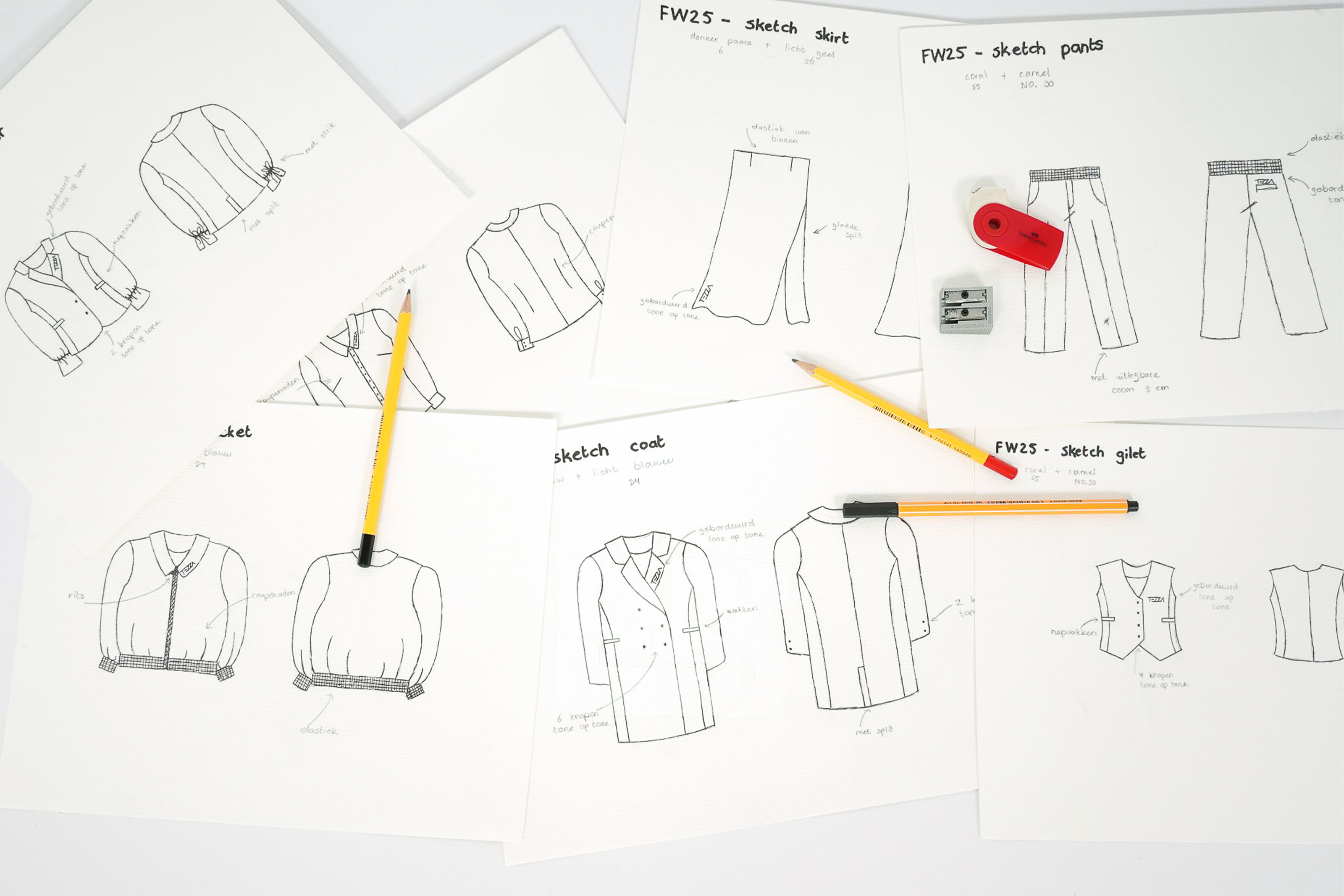 In ons eigen atelier worden de ontwerpen handmatig geschetst en geschilderd, wat elke collectie een unieke en artistieke uitstraling geeft. Alle stukken zijn vervaardigd van hoogwaardige materialen en staan voor kwaliteit die je voelt én ziet.