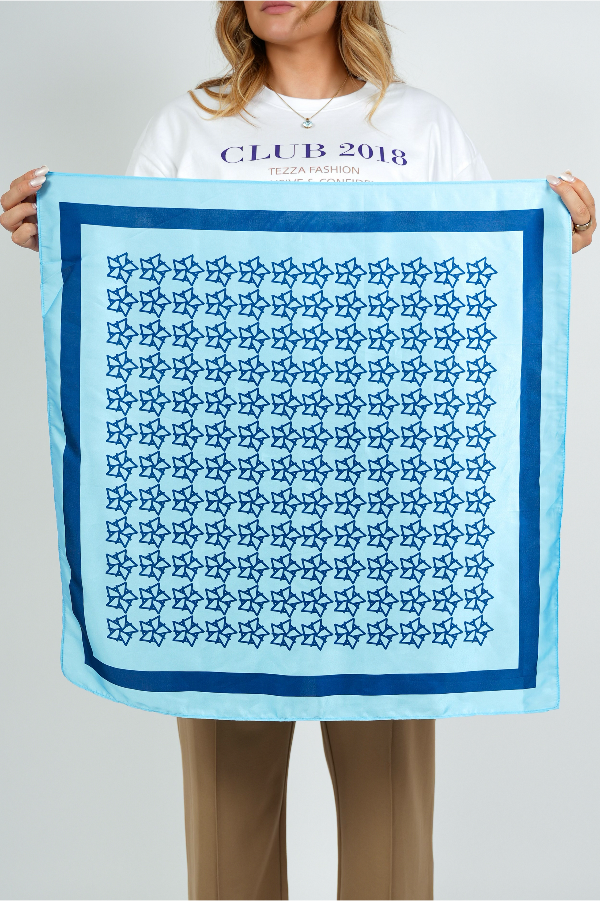 Een elegante en veelzijdige accessoire: de satijnen sjaal in lichtblauw met navy details uit de FW25 collectie. Het logo-icoon vormt een verfijnde print en geeft de sjaal een luxe uitstraling. Met een formaat van 65x65 cm is dit item perfect om op talloze manieren te stylen; van halsdoek tot haaraccessoire of als accent aan een tas.