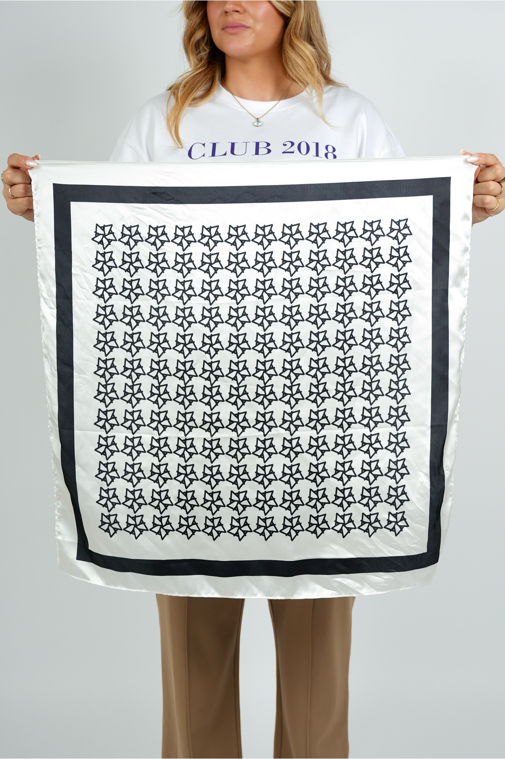 Een tijdloze satijnen sjaal uit de FW25 collectie. Uitgevoerd in wit met zwart, voorzien van het iconische Tezza-logo in all-over print. De zachte satijnen stof en het formaat van 65 x 65 cm maken dit een veelzijdige accessoire dat je eindeloos kunt stylen.